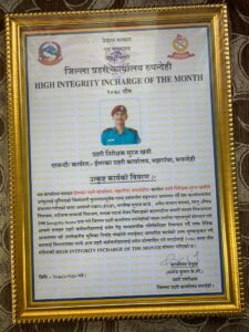 पुष महिनामा सर्वोत्कृष्ट कार्य गरेको भन्दै जिल्ला प्रहरी कार्यालय रुपन्देहीले इन्स्पेक्टर खत्रीलाई दास्रो पटक पुरस्कृत गरेको हो । खत्रीसहित तीन जना प्रहरीलाई ‘हाइ इन्टिग्रेटी इन्चार्ज अफ द मन्थ’ अवार्ड र अभिलेखमा जनिने गरि नगद पुरस्कार समेत प्रदान गरेको छ । उनीहरुलाई जिल्ला प्रहरी कार्यालय रुपन्देहीका प्रहरी प्रमुख प्रहरी उपरीक्षक एसपी मनोजकुमार केसीले शनिबार नगद पुरस्कारसहित सम्मान गरेका हुन् ।